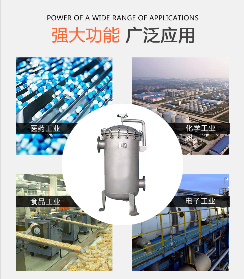 保安過濾器,一般設(shè)置在壓力容器之前,以去除濁度1度以上的細小微粒,來滿足后續(xù)工序?qū)M水的要求;有時也設(shè)置在整個水處理系統(tǒng)的末端,防止細小微粒進入成品水。保安過濾器大都采用不銹鋼做外殼,內(nèi)部裝過濾濾芯(例如PP棉),主要用在多介質(zhì)預(yù)處理過濾之后,反滲透、超濾等膜過濾設(shè)備之前。用來濾除經(jīng)多介質(zhì)過濾后的細小物質(zhì)(例如微小的石英沙,活性炭顆粒等),以確保水質(zhì)過濾精度及保護膜過濾元件不受大顆粒物質(zhì)的損壞。精密過濾裝置內(nèi)裝的過濾濾芯精度等級可分為0.5μm-100μm等,根據(jù)不同的使有場合選用不同的過濾精度,以保證后出水精度及保證后級膜元件的安全。