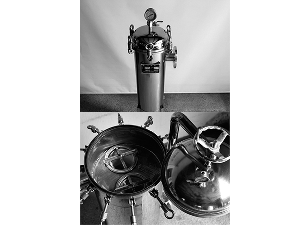 液體從上進口法蘭流入,進入濾袋內(nèi)測,固體雜質(zhì)顆粒在通過濾袋