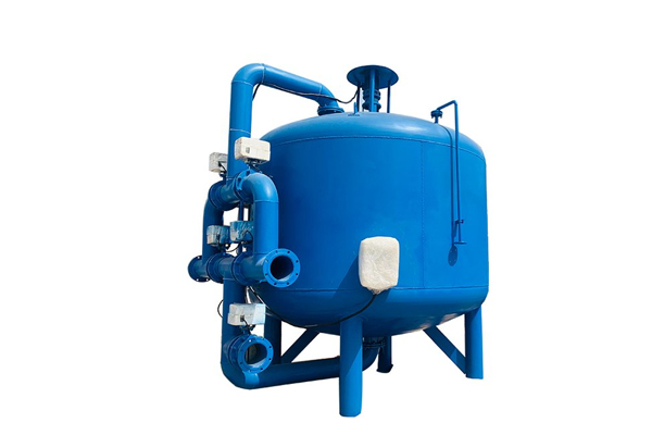 反洗狀態(tài): 隨著雜質(zhì)在填料層中不斷聚積, 內(nèi)部壓頭損失將不斷增大。當(dāng)進(jìn)、出水壓頭損失達(dá)到設(shè)定值時(shí),系統(tǒng)將自動(dòng)激活定壓差裝置使其轉(zhuǎn)換至反洗狀態(tài),電機(jī)帶動(dòng)攪拌器在罐體內(nèi)轉(zhuǎn)動(dòng),更便于清洗聚積起來的雜質(zhì)。當(dāng)系統(tǒng)處于反洗狀態(tài)時(shí),水的流向由底部向上流動(dòng),電機(jī)帶動(dòng)攪拌器充分清洗濾料,由排污口直接流出。反洗后系統(tǒng)回復(fù)正常過濾狀態(tài).