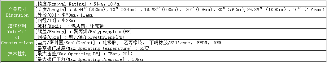 UDF活性炭濾芯系列采用高效活性炭細顆粒加食品級膠粉連續(xù)擠壓成型。該產(chǎn)品不僅具有顆?;钚蕴績?yōu)良的吸附性能,而且還可以避免散狀活性炭釋放碳粉的缺點,可以有效去除液體或氣體中的余氯、異味及有機物。濾芯較內(nèi)層為聚丙烯骨架,用以加強濾芯的耐壓強度。骨架上包有兩層聚丙烯超細纖維氈,能截住液體通過碳芯而帶出大于10微米的顆粒。碳芯外層包有兩層聚丙烯超細纖維氈,能截住液體中大于10-20微米的顆粒,使濾芯具有過濾與凈化雙重功能。較外層為白色塑料網(wǎng)套,使濾芯具有完整的外表與整 潔的外觀。濾芯兩端裝有柔軟的丁睛橡膠端蓋,使濾芯裝入濾筒后具有良好的密封性。成品活性碳濾芯均用塑料薄膜嚴密包封,防止濾芯被污染并保持濾芯經(jīng)常處于清新狀態(tài)。
