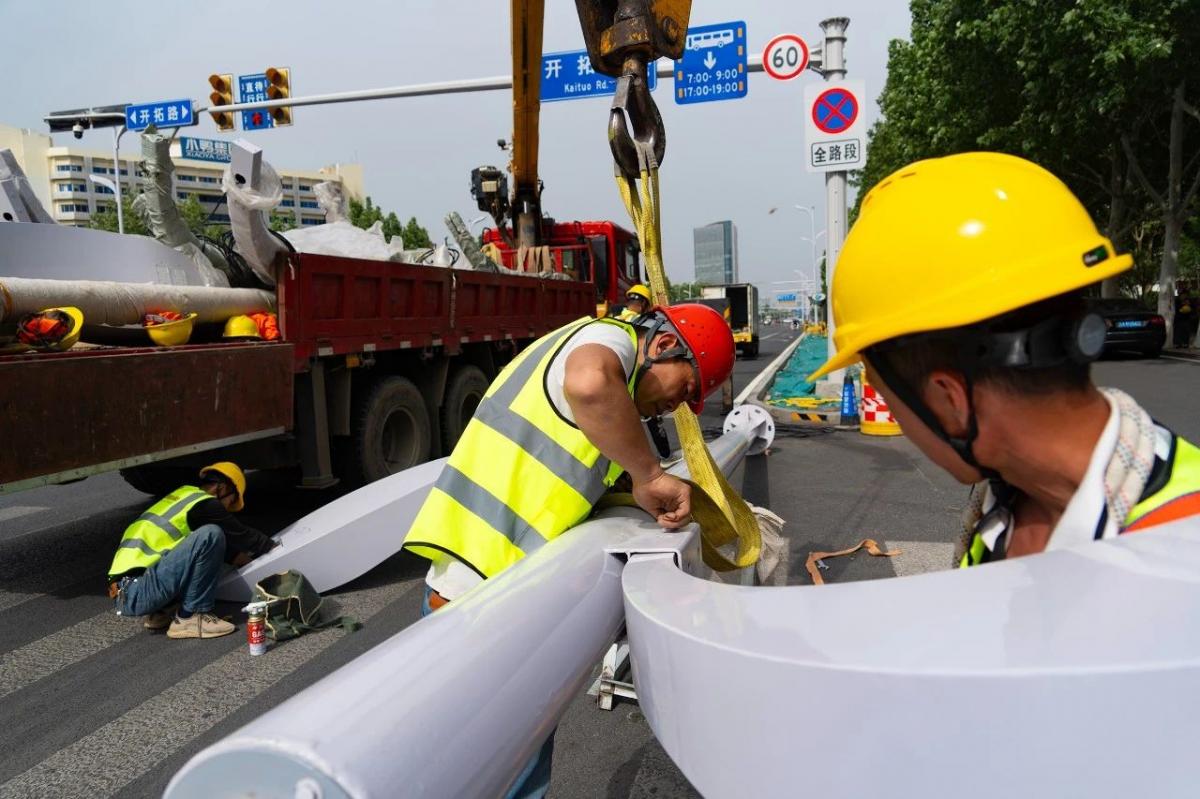 4月30日,記者在工業(yè)南路二環(huán)東路交叉口附近、工業(yè)南路彤霞路交叉口附近看到工人們正在安裝最后6根燈桿、穿線等作業(yè)?!跋韧诼窡艋A(chǔ),然后安裝預(yù)埋件、 安裝燈桿、穿線,整個(gè)流程下來(lái)才算初步安裝完成?!?/div>