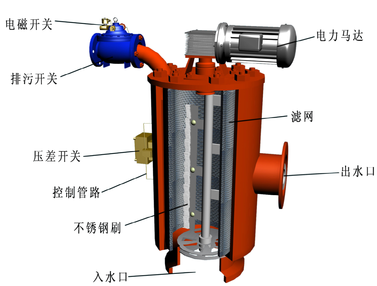電機(jī)驅(qū)動(dòng)刮刷做水平旋轉(zhuǎn)運(yùn)動(dòng)清洗濾網(wǎng),刮刷旋轉(zhuǎn)時(shí)雜質(zhì)被刷子清除順濾網(wǎng)流到過濾器底部,大比重雜質(zhì)沉淀到集污腔。每次清洗由數(shù)次沖程組成,濾網(wǎng)表面清洗后,恢復(fù)過濾能力。清洗時(shí)正常過濾,流量不中斷。