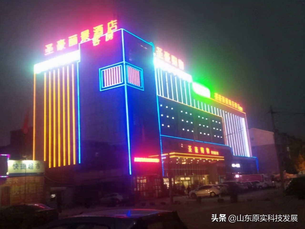 濱州圣豪麗景商務(wù)酒店樓頂鋁板沖孔發(fā)光字與鋁板沖孔燈條