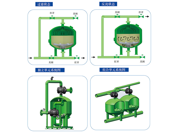 過濾系統(tǒng)的反洗有手動,半自動和全自動三種方式,分別可通過手動按鈕、PLC、壓力差或者管理系統(tǒng)進行啟動。反洗周期和反洗時間長短可調(diào),出廠時設(shè)定為3分鐘。用戶也可選擇PLC控制系統(tǒng),可以實現(xiàn)集中或遠(yuǎn)程通訊等高要求的控制。